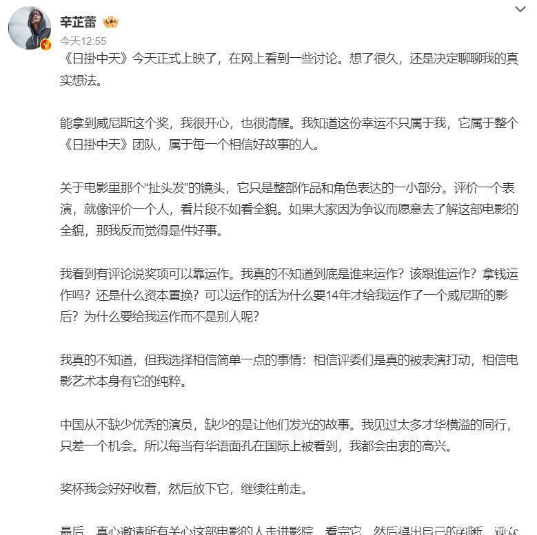 暗戳戳说奖项是“运作”来的。辛芷蕾也不恼,发文回应第一时间把功劳分给团队,说 “幸运不只属于我”;面对 “扯头发” 镜头的争议,她也不解释,而是坦然说 “看片段不如看全貌”,甚至觉得有争议能让人关注电影全貌是件好事;被质疑奖项靠运作,她没气急败坏,只是真诚发问 “能运作为什么要等 14 年”,是啊,真要能靠资本开路,她辛芷蕾何必等到今天?